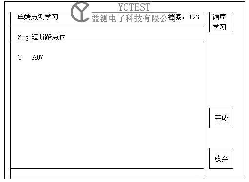 使用自動尋點探針,并將其置入線材指定之點位上(比喻是A01代表紅線),按下S1“循環學習”鍵再用探針接觸(黃線顯示A02),按S1學習,再接觸(白線顯示A03)按S1鍵學習…….可如此多點點測學習,學習完畢再按S4“完成”鍵,LCD將顯示上述畫面和最后點測點位(如A07)再按Enter鍵存檔,按EXIT鍵跳離后,按Test鍵即可依次進行點測。